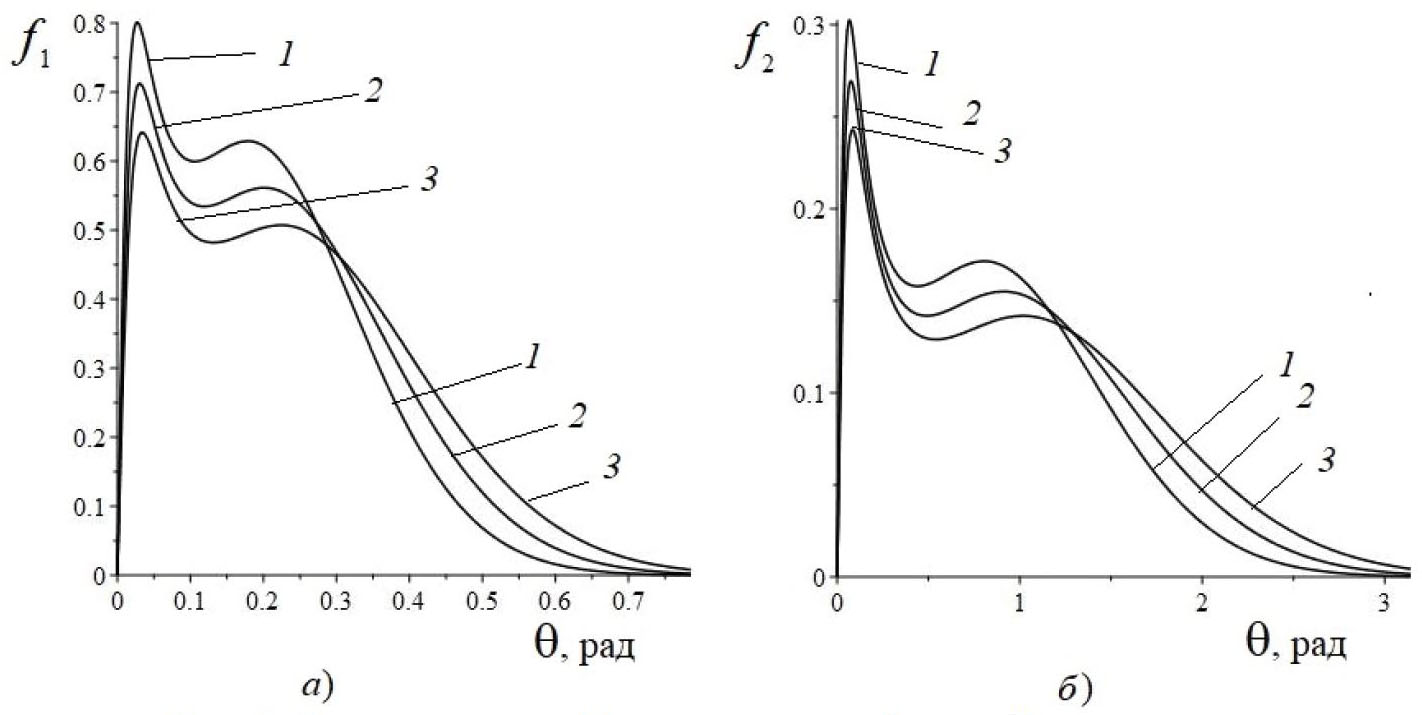 Рис. 1. Зависимости дифференциальных функций распределения числа частиц природного песка (а) и манной крупы (б) по полярной угловой координате θ при ω, с-1: 1 – 41,9; 2 – 47,1; 3 – 52,4