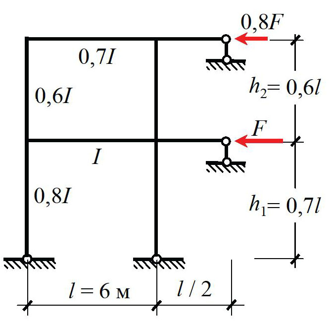 Для иллюстрации предложенного подхода приведен пример расчета стальной двухэтажной рамы на действие горизонтальных сил, моделирующих сейсмическое воздействие (рис. 2).