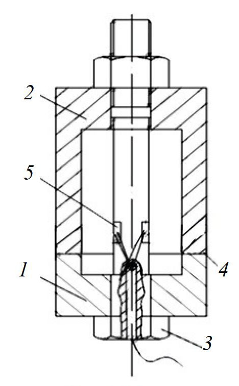 Физическая модель состоит из стальных втулок нижней 1 и верхней 2, контактирующих по поверхности 4, имитирующих фланцы, болта 3 с тензодатчиками 5 (рис. 2). Втулки изготовлены из стали 45, наружный диаметр втулок – 60 мм, внутренний – 40 мм. Втулки стягиваются болтом М16´2. На стержень болта наклеены три тензодатчика под углом 120° с их последовательным соединением. Внутри болта сделано отверстие d = 3 мм для выхода проводов тензодатчиков к тензостанции, усилителю сигнала и компьютеру (на рисунке не показаны).