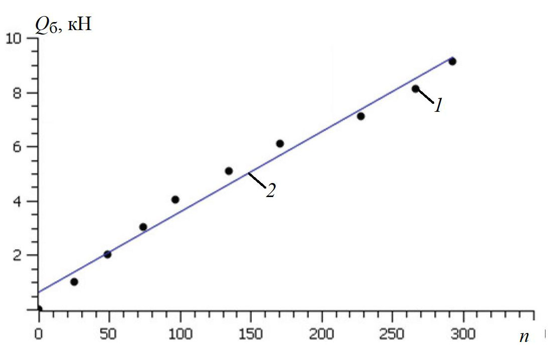Рис. 4. Тарировочная кривая нагружения болта М16×2: 1 – показания тензодатчика n; 2 – линейная аппроксимация Q = 0,0295n + 0,6