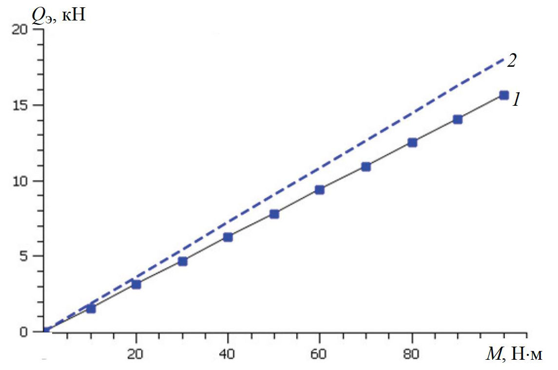 На рисунке 5 в качестве примера представлены результаты экспериментов в сравнении с аналитическими данными для болта М16´2. Полученные аналитические и экспериментальные зависимости Qэ = f(M) описываются выражениями, представленными в табл. 2.