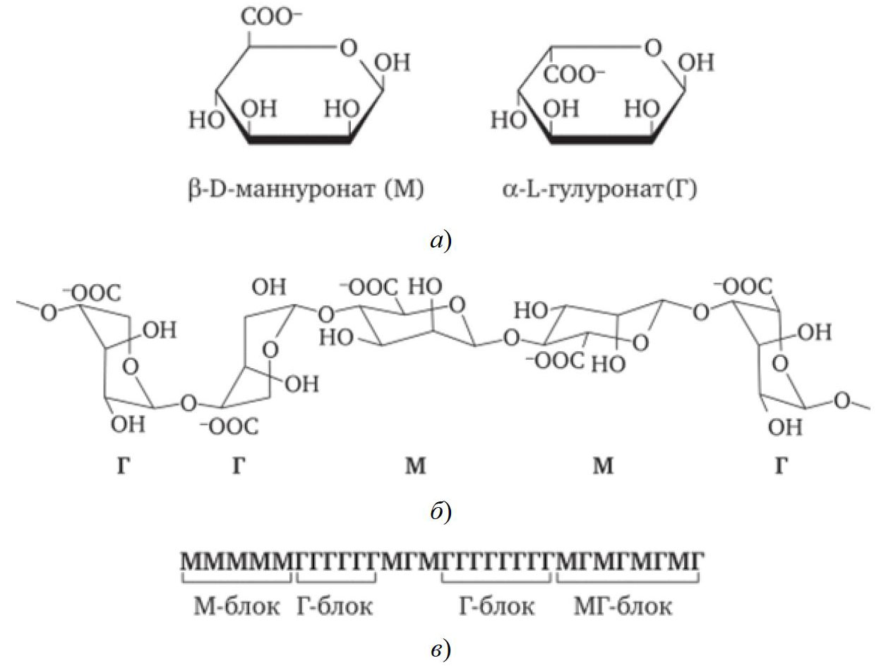 Альгинат – природный водорастворимый полисахарид, состоящий из связанных 1,4-гликозидной связью остатков a-L-гулуроновой кислоты (Г) и остатков β-D-маннуроновой кислоты (M) в различном соотношении (рис. 1) [12].