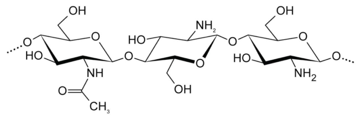 Хитозан представляет собой природный полисахарид, который состоит из звеньев N-ацетилглюкозамина (2-ацетамидо-2-дезокси-β-d-глюкопиранозы) и глюкозамина (2-амино-2-дезокси-β-глюкопиранозы) (рис. 2) [16].