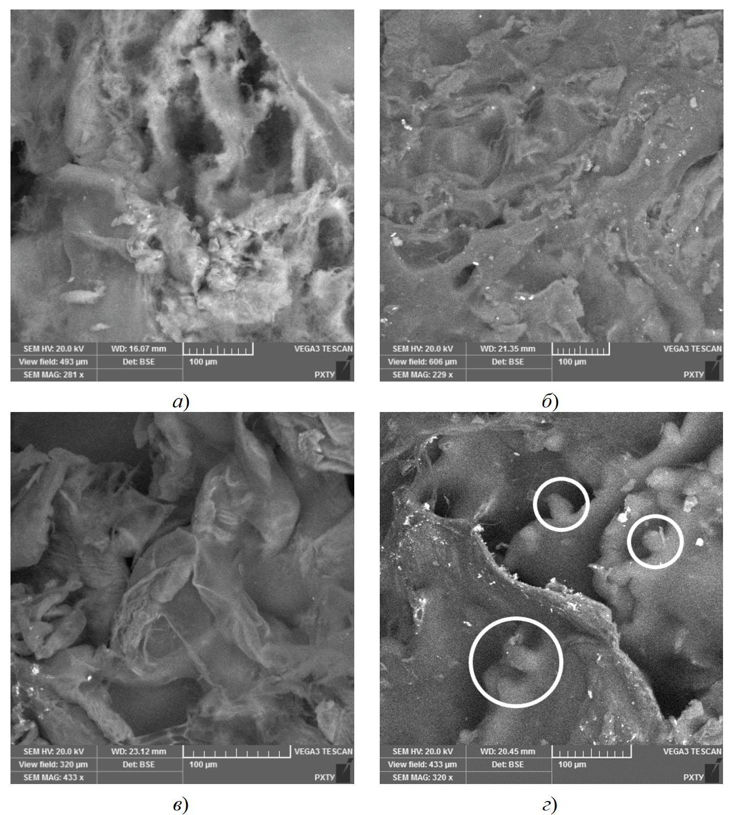 Рис. 6. Изображения внутренней структуру аэрогелей на основе полиэлектролитного комплекса с варьированием соотношений альгинат натрия : хитозан: а – 1 : 0,25; б – 1 : 0,5; в – 1 : 0,75; г – 1 : 1