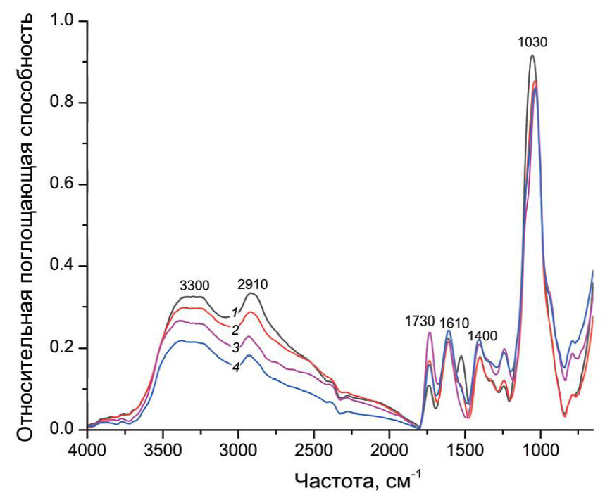 Рис. 8. ИК-спектры аэрогелей на основе полиэлектролитного комплекса «альгинат натрия – хитозан» при соотношениях: 1 – 1:1, 2 – 1:0,75; 3 – 1:0,5; 4 – 1:0,25