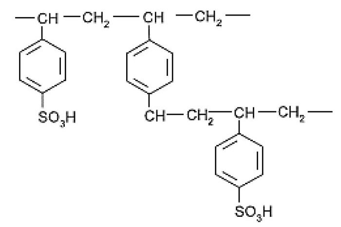 Объект исследования – отечественная ионообменная мембрана МК-40 производства ООО «Щекиноазот» (Россия). Данный вид мембран широко применяется в процессах электродиализа и мембранного электролиза [8]. Основой мембраны МК-40 является синтетическая ионообменная смола КУ-2, полученная путем сополимеризации стирола и дивинилбензола с последующим сульфированием для введения ионогенногенных групп (рис. 1). В качестве инертного наполнителя при изготовлении данной мембраны используется полиэтилен, армирующей тканью служит капрон [7].