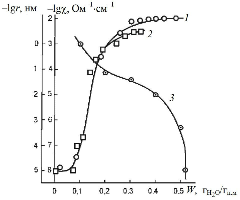На рисунке 4 представлены зависимости удельной электропроводности мембран МК-40 от влагосодержания в растворах хлорида натрия 1 и хлорида никеля 2 (концентрация 0,2 моль-экв/л).Очевидно, что на кривых имеется некоторое значение влагосодержания Wk, называемое в [12] критическим влагосодержанием, ниже которого (W < Wk) удельная электропроводность у образцов мембран практически отсутствует, а при значениях W > Wk она экспоненциально растет.