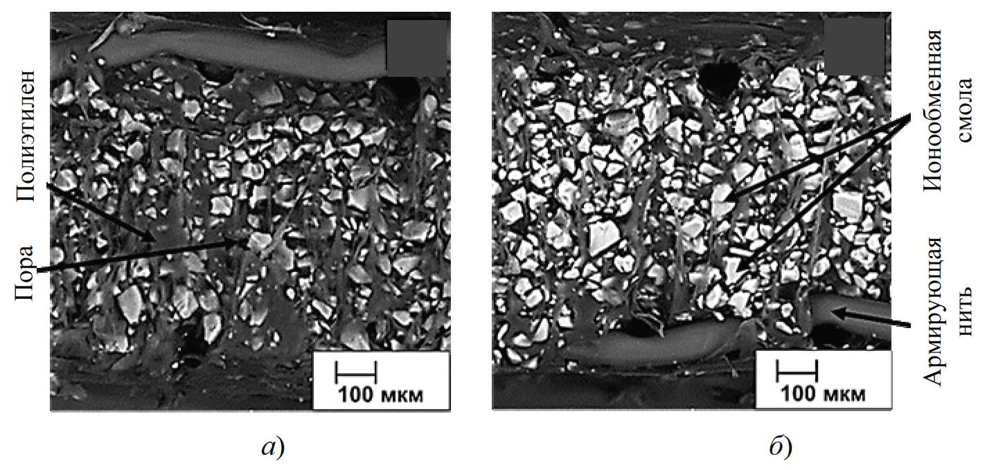 Рис. 6. Электронные микрофотографии среза мембраны МК-40 (BSE-изображение) (500): а – в Н-форме; б – в Ni-форме (поле обзора 508 мкм, напряжение 30,0 кВ)