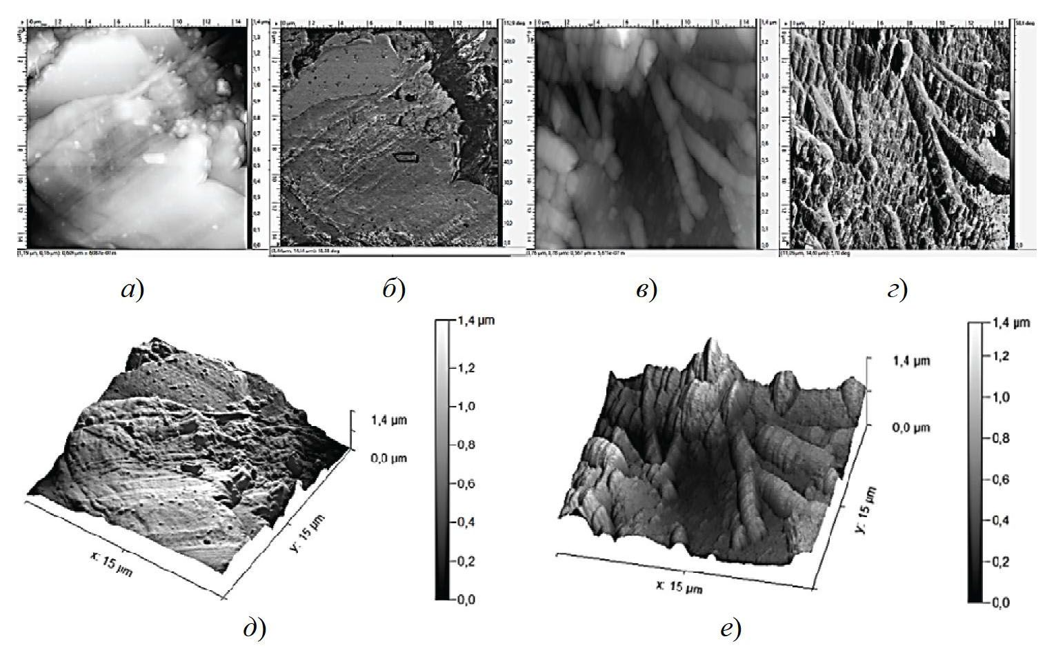 Рис. 7. АСМ-изображения поверхности мембраны МК-40 в Н-форме (а, б, д) и Ni-форме (в, г, е) в режиме топографии (а, в), фазового контраста (б, г) и 3D-изображения (д, е) при площади сканирования 15 15 мкм