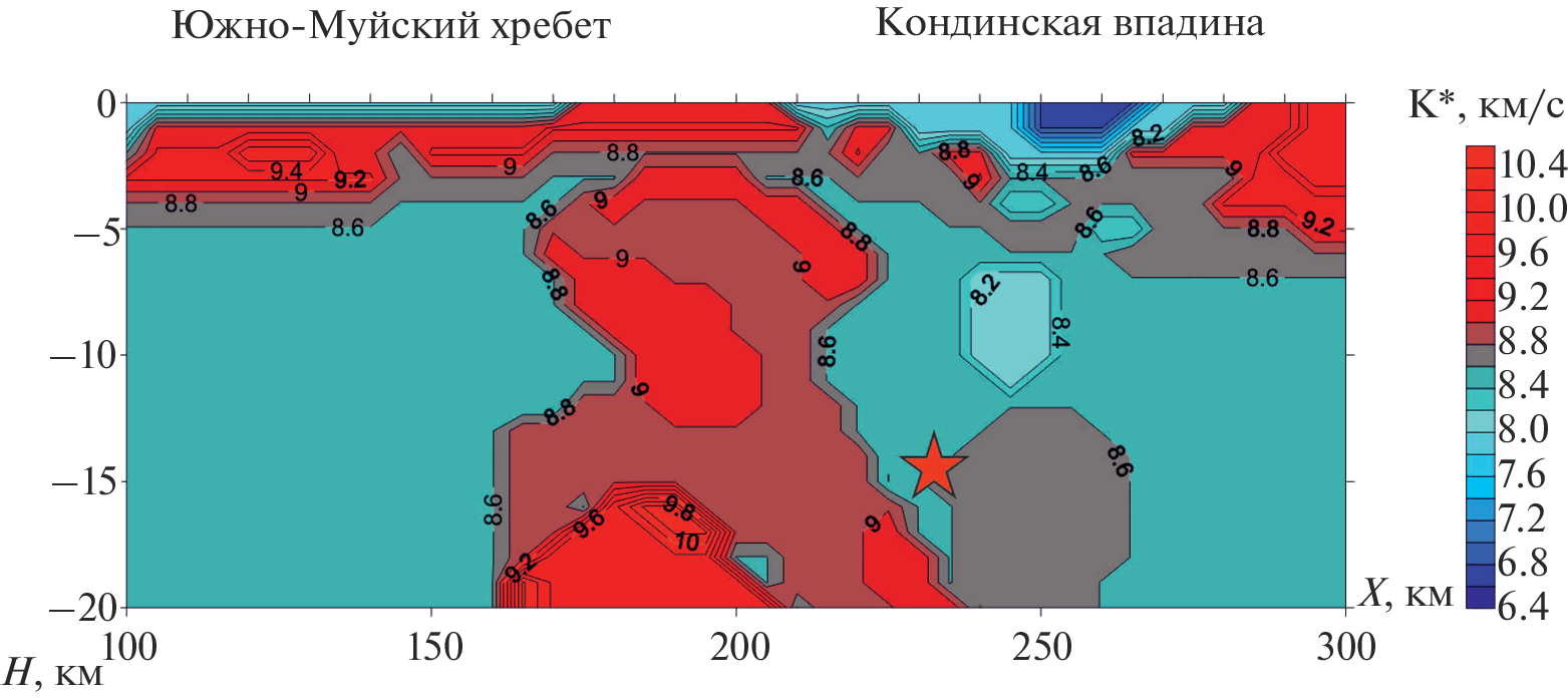 The paper presents analysis of the seismicity and deep structure of the Trans-Baikal region in the section of the reference geophysical profile 1-SB. It was determined that the Earth’s crust and upper mantle has a complex heterogeneous structure. The thickness of the Earth’s crust varies from 40 km in the South-Eastern part of the profile and in the areas of intermountain depressions in the North-Western part, and up to 48 km in the areas of mountain ranges. The values of the boundary velocities along the M boundary also vary greatly, from higher values of 8.4‒8.5 km/s for P-waves and 4.9‒4.95 km/s for S-waves (especially in the South-Eastern part of the profile) to reduced values of 7.8‒8.0 km/s for P-waves and 4.6‒4.7 km/s for S-waves in the section of the Baikal rift zone in the North-Western part of the profile. A strong inhomogeneous structure of the medium in terms of elastic wave velocities, Vp/Vs velocity ratios, and the Poisson’s ratio is determined for the upper and the middle crust at depths of 8‒20 km. The authors determined that zones of increased seismicity are referred to blocks of the Earth’s crust with inhomogeneous velocity structure according to data of differently polarized P- and S-waves. The area of the Baikal rift zone, in the immediate vicinity of the largest Muya earthquake of 1957 with M = 7.6, is characterized by elevated inhomogeneity in the upper part of the Earth’s crust according to the elastic wave velocities and secondary parameters of the medium (Vp/Vs ratio, K* = = Vp/(γ – 1), where γ = Vp/Vs, Poisson’s ratio (σ)). A number of other inhomogeneous deep zones have also been identified in the profile based on anomalies of P- and S-waves velocities and secondary parameters of the medium, which correlate to varying degrees with seismically active sites according to long-term instrumental observations. The established unambiguous connection of large inhomogeneous zones of the upper crust of the Trans-Baikal region with the accumulation of stresses and their discharge in the form of strong earthquakes allows us to make a reasonable medium-term forecast of catastrophic events.