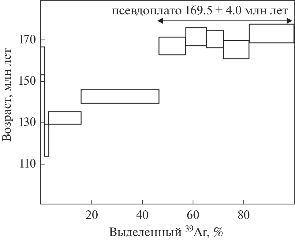 Described of structure, mineralogy and age of ore and hosted rocks of the recently explored Nizhniy Birkachan Au-Ag epithermal deposit. The orebodies is a quartz-carbonate-adularia veins and veining zones, that hosted porphyry granodiorites with U-Pb age (ID-TIMS) 335 ± 2 Ma. The ore contain low sulfides, low Ag grades. Main ore minerals – pyrite. Silver minerals represented by tennantite-tetraedrite, Ag sulfide, native Au and Ag, gessite, The 40Ar/39Ar age of adularia from vein 169 ± 4 Ma. This young age we explain by rejuvenation of isotope system after intrusion of non-mineralizied Jurassic mafic dykes. The main features of Nizhniy Birkachan Au-Ag epithermal deposit similar with other Au-Ag deposits of Kedon magmatic belt of the Omolon massif. All that was formed in 290–335 Ma age interval.