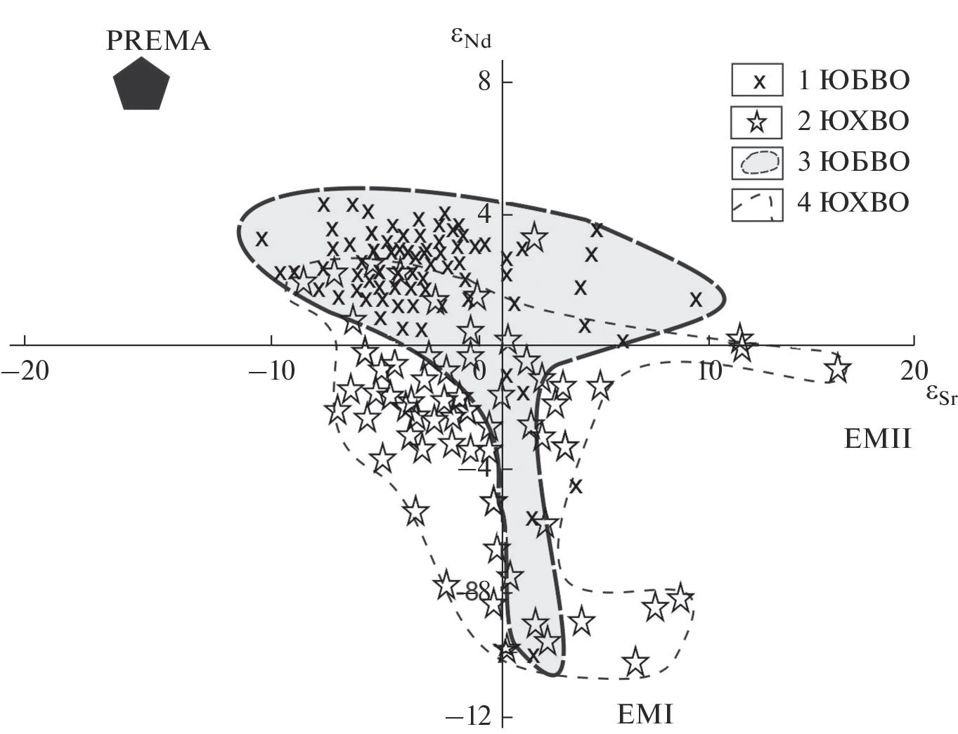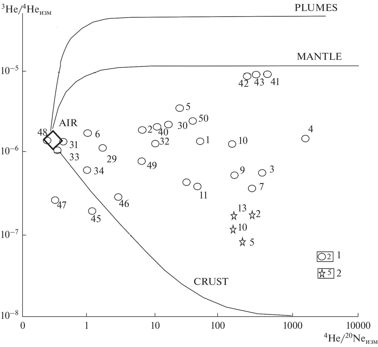 В статье рассмотрен изотопный состав гелия (3Не/4Не = R) в подземных водах Южно-Байкальской (ЮБВО) и Южно-Хангайской вулканических областях (ЮХВО) в позднекайнозойский период. Установлены различия в поведении и величине этого параметра. Установлено, что различия в содержаниях 3Не/4Не в ЮБВО и ЮХВО отвечают мантийным резервуарам, имеющим разный изотопный состав гелия. Это подтверждает, что позднекайнозойский вулканизм ЮБВО и ЮХВО контролируется мантийными источниками, связанными с мантийными плюмами Центрально-Азиатского горячего поля мантии.