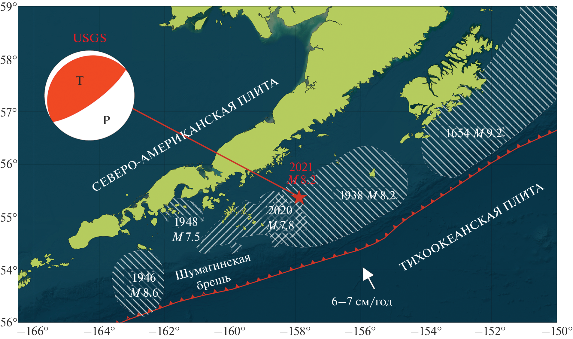 - Liu C., Lay T., Xiong X. The 29 July 2021 Mw 8.2 Chignik, Alaska Peninsula earthquake rupture inferred from seismic and geodetic observations: Re-rupture of the western 2/3 of the 1938 rupture zone // Geophys. Res. Lett. 2022. V. 49. № 4. P. 1‒9. https://doi.org/10.1029/2021JB023676