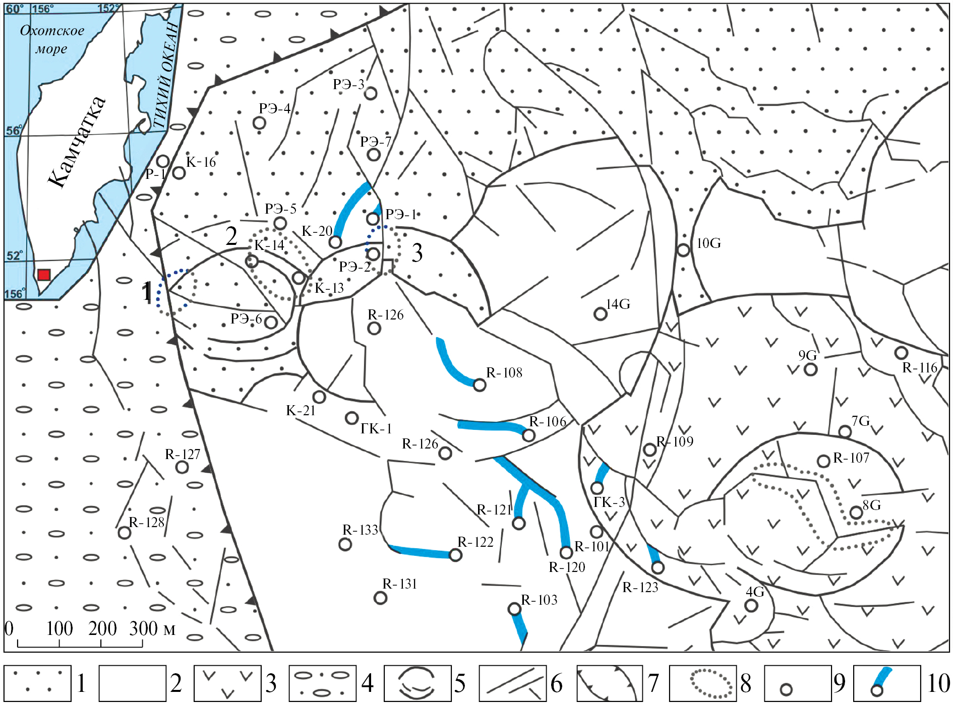 Рис. 1. Схематическая геологическая карта Паужетского геотермального месторождения, (по [Структура ..., 1993] с изменениями). 1 – туффиты и туфы паужетской свиты; 2 – лаво-экструзивный комплекс дацитов и риолитов Камбального вулканического хребта; 3 – то же, андезитов и андезибазальтов; 4 – аллювиальные отложения; 5 – кольцевые тектонические нарушения; 6 – то же, линейные; 7 – Паужетский грабен; 8 – термальные поля (1 – Южно-, 2 – Верхне-, 3 – Нижне-, 4 – Восточно-Паужетское); 9 – скважины; 10 – цеолит-кремнистые “плащи”.