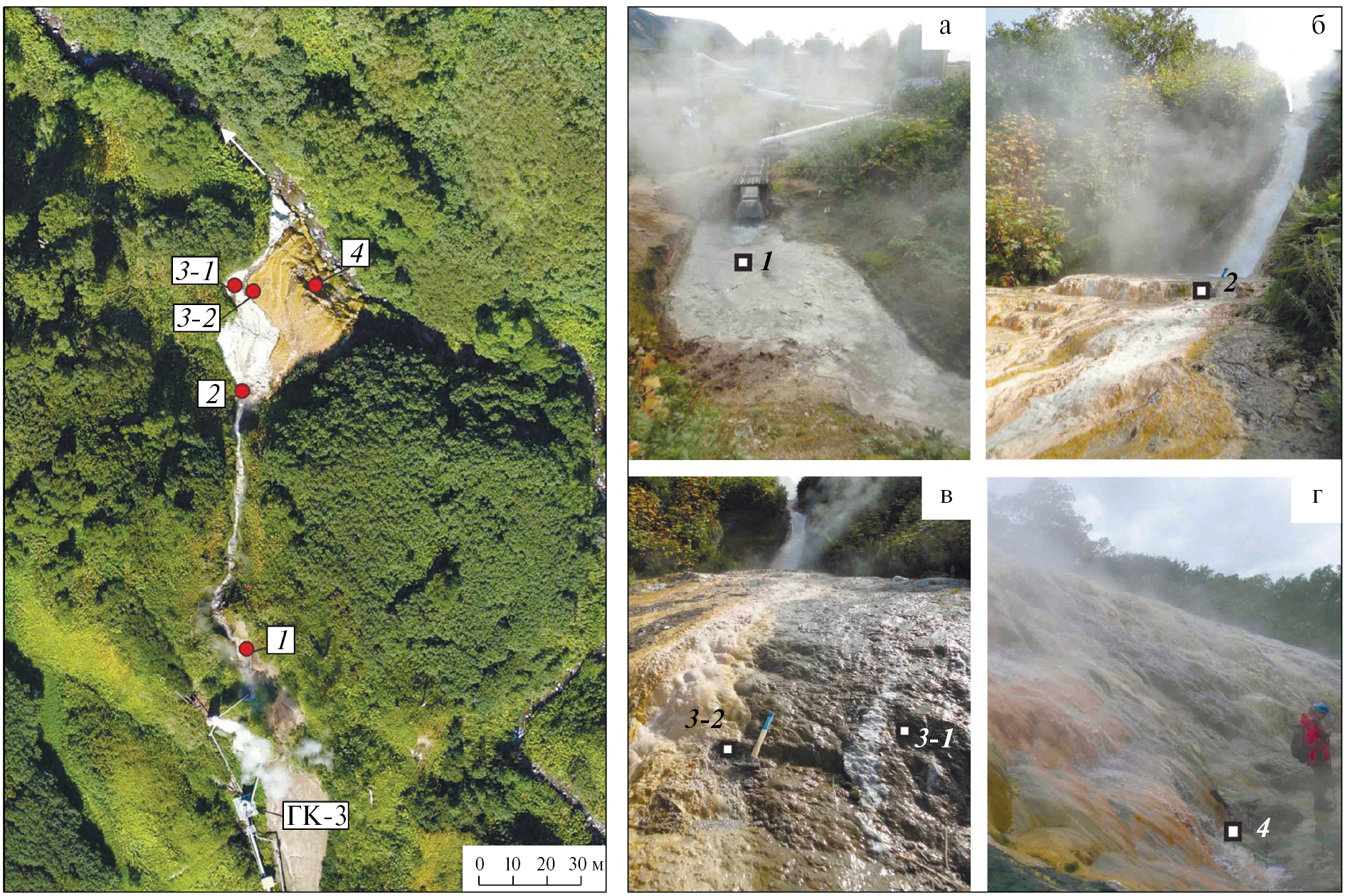 Рис. 2. Схема опробования минеральных отложений на скважине ГК-3. На левом фрагменте – ортофотоплан участка местности (составлен М.С. Черновым) и точки отбора проб по простиранию “плаща”; на правом фрагменте – фотографии точек отбора проб (а – под зумпфом скважины, б – под водопадом, в – под следующим уступом, г – под последним крупным уступом перед впадением потока термальных вод в холодный ручей Быстрый).