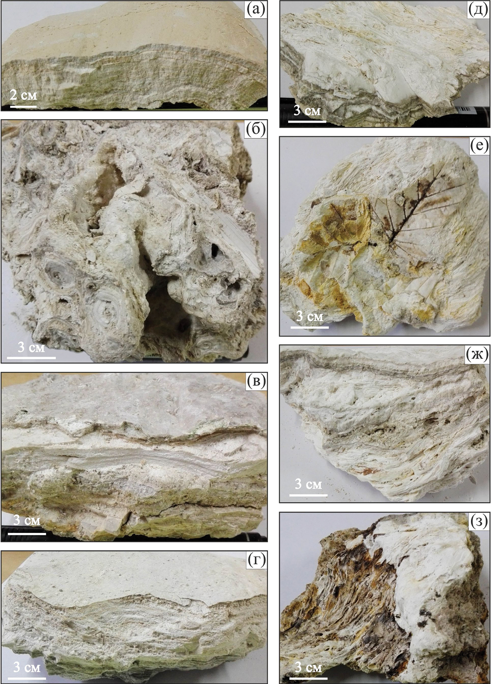 Минеральные отложения имеют белый, бежевый или светло-розовый цвет. Верхние горизонты плотные и жесткие, характеризуются слоистой текстурой (рис. 3). Мощность слоев от 1‒2 до 50 мм. Строение осадков, в основном, зависит от динамики водного потока – в частности, под резкими уступами (водопадами) образуется конгломерат из округлых фрагментов плотного вещества с обилием пустот за счет механического вымывания рыхлого цемента (см. рис. 3б). Строение отложений неоднородно в каждой точке опробования: разнообразием структур отличаются сухие участки “плаща”, по-видимому, прошедшие более длительный этап гидротермального изменения (см. рис. 3в, 3г). На участках с максимальной мощностью отложений (обычно на фронте потоков) под коркой жесткого материала наблюдаются спутанно-волокнистые агрегаты, происходит захоронение органики, частиц почвы и обломков пород (см. рис. 3д, 3е, 3ж, 3з). В целом, эти минеральные новообразования не плотные (0.8 г/см3), гигроскопичные (2.7%), с повышенной общей пористостью (60%), анизотропные (К = 1.47), малопрочные (3.6 МРа) [Frolova et al., 2006]. Большую роль в формировании минеральных отложений играют сине-зеленые водоросли и различные бактерии, но этот аспект проблемы требует специальных исследований и частично рассмотрен ранее [Структура ..., 1993].