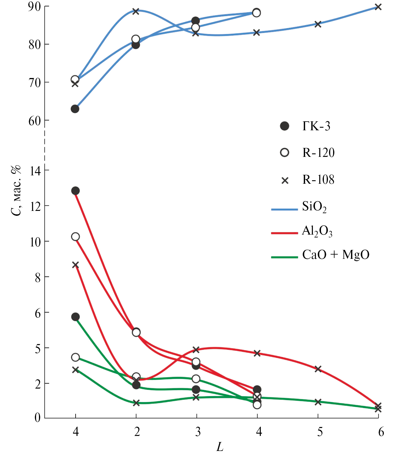 Рис. 4. Диаграмма распределения значений основных химических компонентов по простиранию “плащей” скважин ГК-3, R-120 и R-108, согласно данным табл. 1 (для построения графиков по скважине ГК-3 использованы значения № 1‒4).