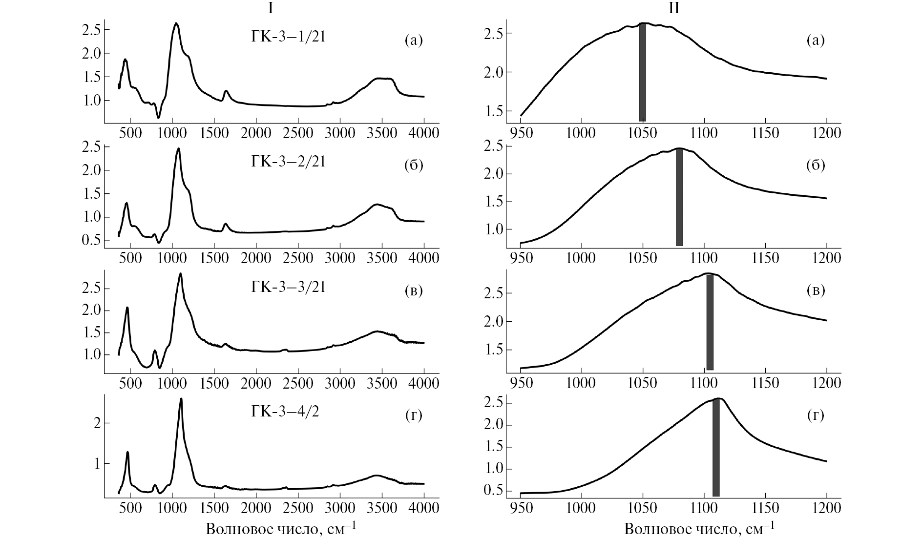 Рис. 6. Инфракрасные спектры минеральных отложений скважины ГК-3 в 2021 г. а – начало “плаща”, около зумпфа; б – 80 м от зумпфа; в – 110 м от зумпфа; г – 130 м от начала “плаща”; I – полный спектр в диапазоне 400–400 см–1; II – положение основной полосы в диапазоне 950–1200 см–1.