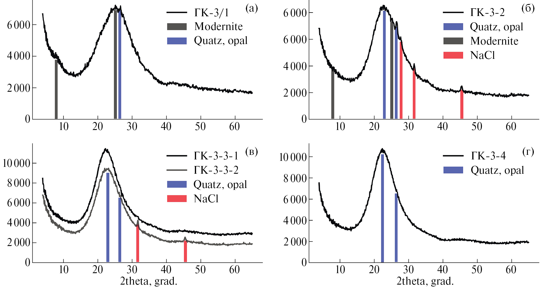 Рис. 8. Дифрактограммы отложений скважины ГК-3 по результатам опробования в 2021 г. На изливе, около зумпфа (а); в 80 м от зумпфа (б); в 110 м от зумпфа (в); в 130 м от зумпфа – перед впадением в руч. Быстрый (г).