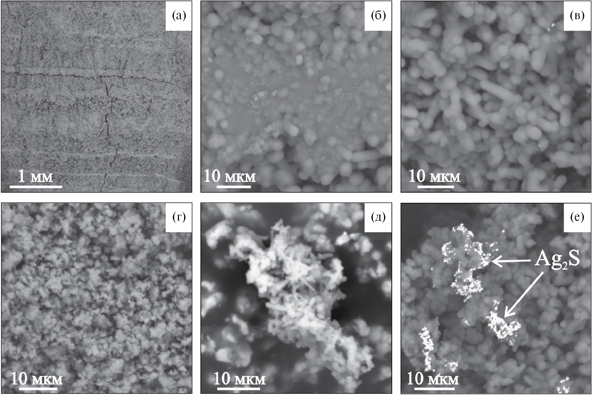 Рис. 9. Структура цеолит-кремнистых отложений на изливе термальных вод из скважины ГК-3. а – слоистость, б – глобулярный морденит в кремнистой массе, в – цилиндрический морденит, г – комковатый морденит, д – игольчатый морденит, е – акантит (Ag2S) –морденитовые агрегаты на поверхности глобулярного морденита. Рельефная поверхность. Снимки BSE.