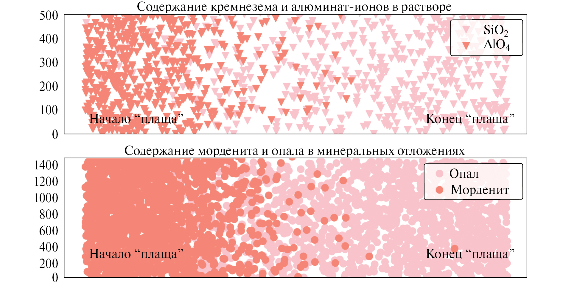 На Паужетском геотермальном месторождении происходит образование минеральных отложений в результате сброса термальной воды из сепараторов ряда скважин на дневную поверхность. Отложения заполняют распадки и долины ручьев в виде “плащей” протяженностью от десятков до нескольких сотен метров и мощностью до 0.5‒0.8 м. В начале сброса термальной воды отложения имеют морденитовый или смешанный алюмосиликатный состав, далее по простиранию “плащей” доля морденита резко снижается, осадки становятся опаловыми. Уменьшение доли морденитовой компоненты коррелирует со снижением концентрации бария, стронция, рубидия и цезия, которые преимущественно входят в состав цеолитовых структур. На рис. 10 схематично показано изменение фазового состава цеолит-кремнистых отложений и его корреляция с составом термальных вод по простиранию “плащей”: по мере осаждения из растворов основных элементов, необходимых для формирования цеолитов, отложения становятся полностью опаловыми.