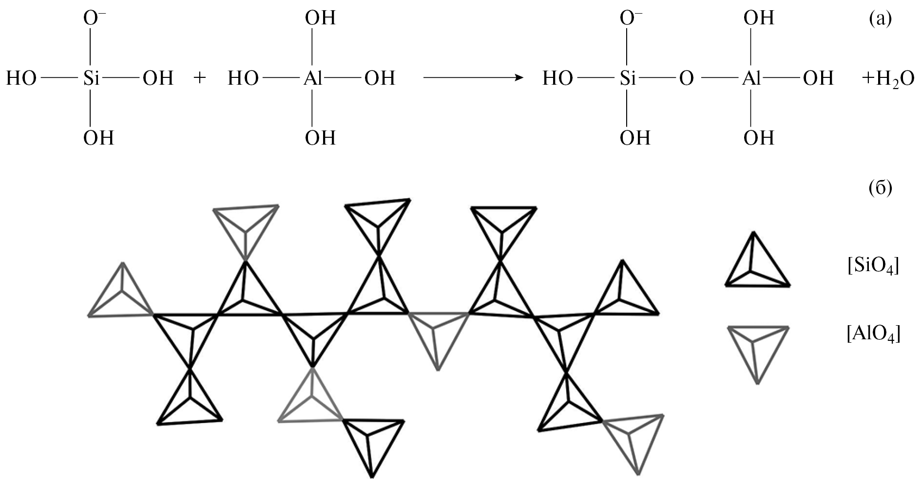 Рис. 11. Схема поликонденсации алюминатных и силикатных ионов с образованием гетероцепочек. а – схематичное уравнение, б – формирование структурных мотивов цеолитов.
