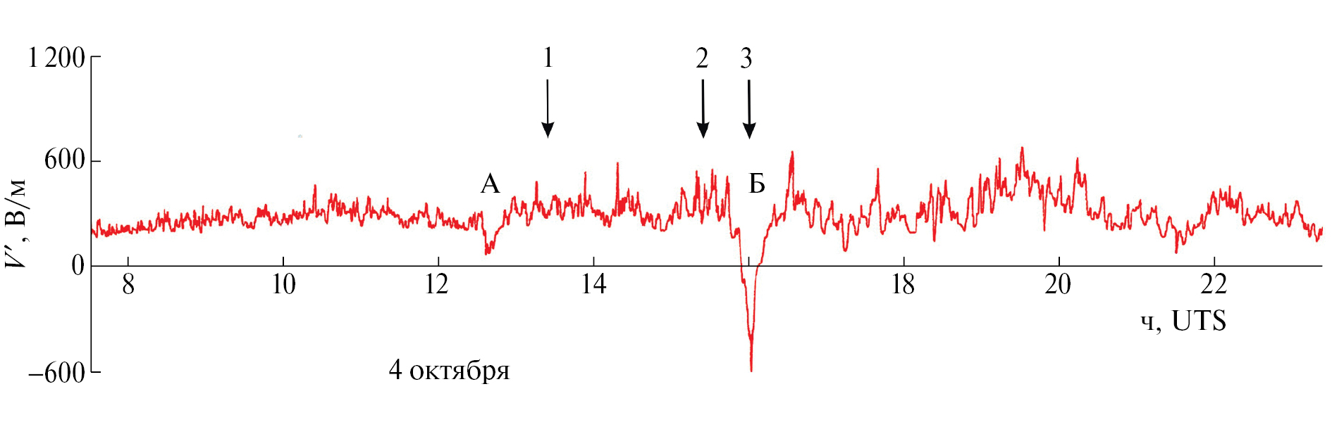 Рис. 1. Регистрограмма градиента потенциала V´ атмосферного электрического поля во временной окрестности катастрофического Шикотанского землетрясения 4 октября 1994 г. Стрелками отмечены: 1 – главный толчок магнитудой Мw = 8.3; 2, 3 – самые сильные за 4 октября афтершоки, Мb = 6.3 https://earthquake.usgs.gov/earthquakes/search/). А, Б – отрицательные бухтообразные аномалии градиента потенциала V´.