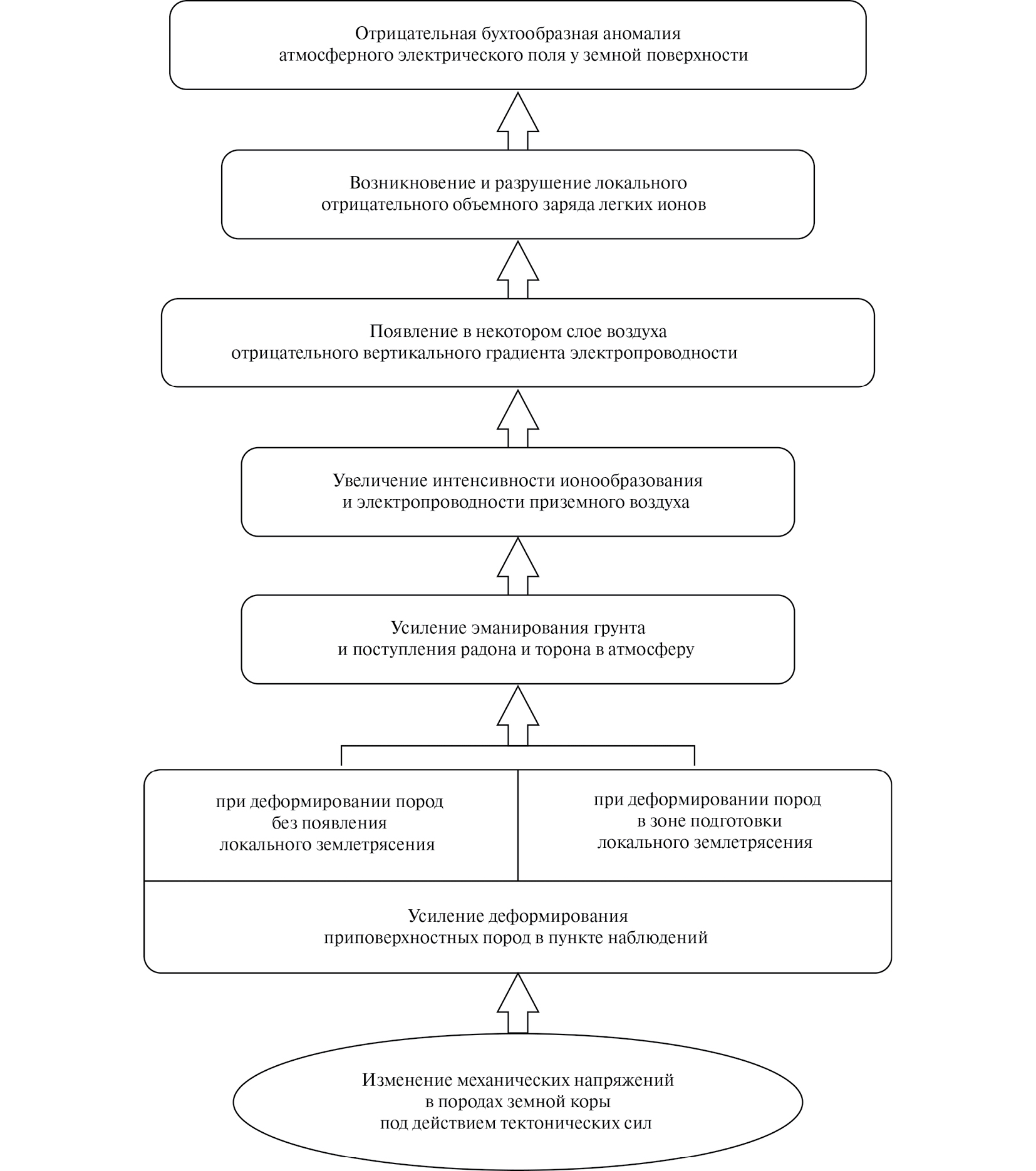 Суммируя полученные результаты, можно предложить схему образования отрицательных бухтообразных аномалий АЭП у земной поверхности в сейсмоактивных регионах при “хорошей” для атмосферно-электрических наблюдений погоде (рис. 2). Эти аномалии возникают при последовательном возмущении деформационного, эманационного и аэроэлектрического полей у границы земная кора – атмосфера. Возмущение каждого из них имеет источник в возмущении предыдущего и является источником возмущения последующего. У каждого возмущения есть свои особенности генезиса, но все они порождены изначально изменением механических напряжений в породах земной коры под действием тектонических сил. Изменение этих напряжений вызывает усиление деформирования приповерхностных пород в пункте наблюдений, которое возникает при деформировании пород без появления локального землетрясения (первый случай) и при деформировании в зоне подготовки такого землетрясения (второй случай). В обоих случаях усиливается эманирование грунта и поступление радона и торона в атмосферу, что приводит к увеличению интенсивности ионообразования и электропроводности приземного воздуха. При появлении в его некотором слое отрицательного вертикального градиента электропроводности возникает локальный отрицательный объемный заряд легких ионов. Возникновение и разрушение этого заряда порождают отрицательную бухтообразную аномалию АЭП, имеющую, как заряд, деформационно-эманационную природу. Таким образом, через ионизацию приземного воздуха радоном и тороном механическая энергия деформации приповерхностных пород преобразуется в энергию электрического поля в этом воздухе.