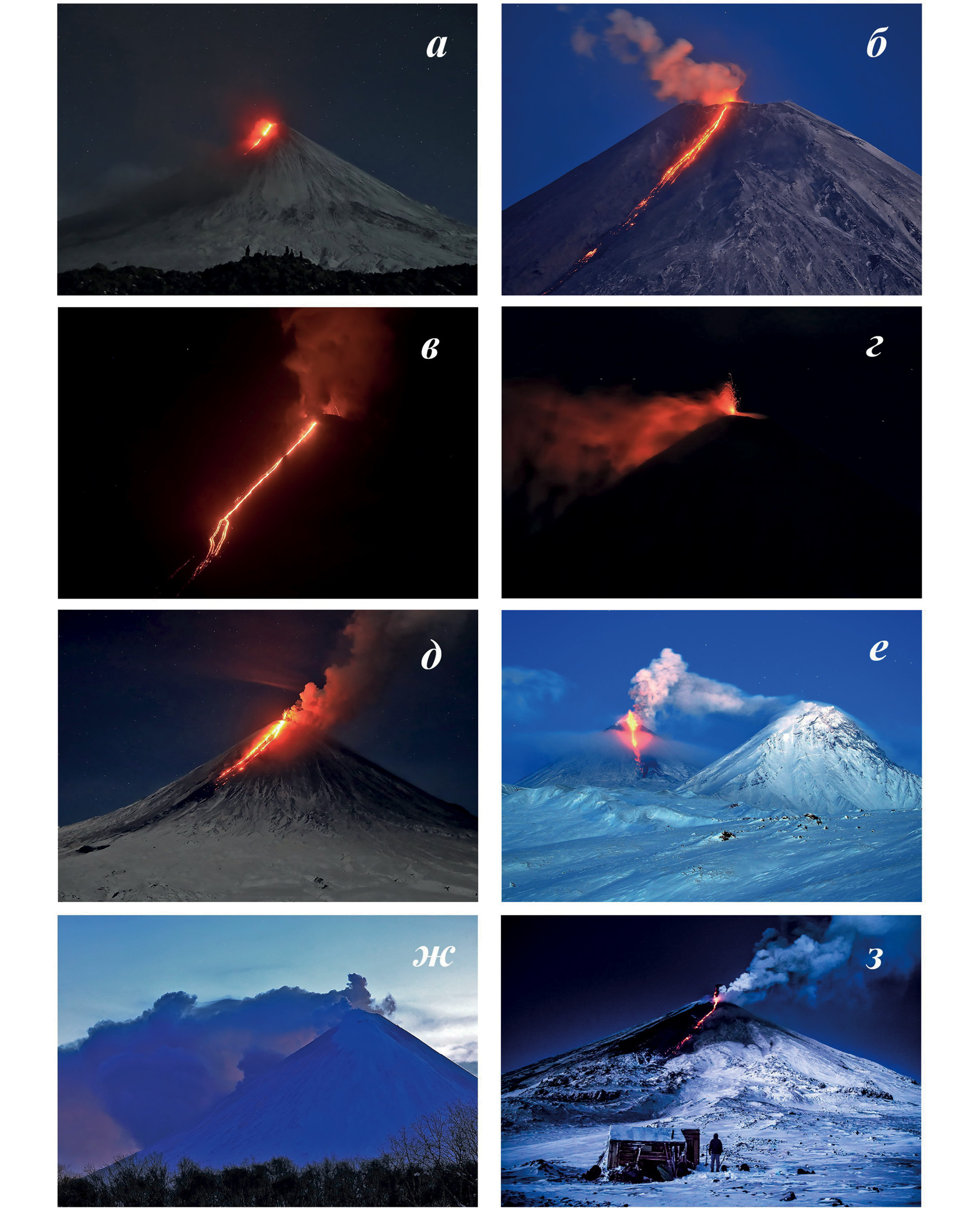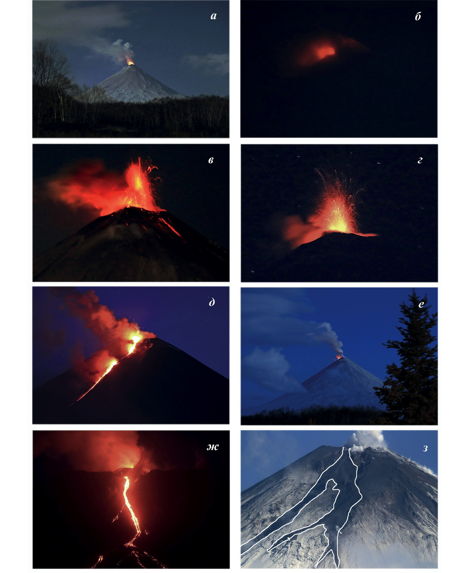 Рис. 5. Характерные моменты ІІ этапа извержения (02.10.2020–08.02.2021 гг.). а – возобновление излияния лавы в Апахончичский юго-восточный желоб 7 октября 2020 г.; б – фонтанирование лавы и ее излияние в юго-восточный желоб 24.10.2020 г.; в – фонтанирование лавы и ее излияние в юго-восточный желоб 13.11.2020 г.; г – продолжение излияния лавы в юго-восточный желоб 21 ноября 2020 г.; д – усиление излияния лавы в юго-восточный желоб 6 декабря 2020 г.; е – излияние лавы на юго‒юго-западный склон вулкана, поток опустился до 3.7 тыс. м 24.12.2020 г., справа – потухший вулкан Камень; ж – сход палящих лавин в юго-восточный желоб 2 января 2021 г.; з – излияние лавы на юго‒юго-западный склон 4 января 2021 г.