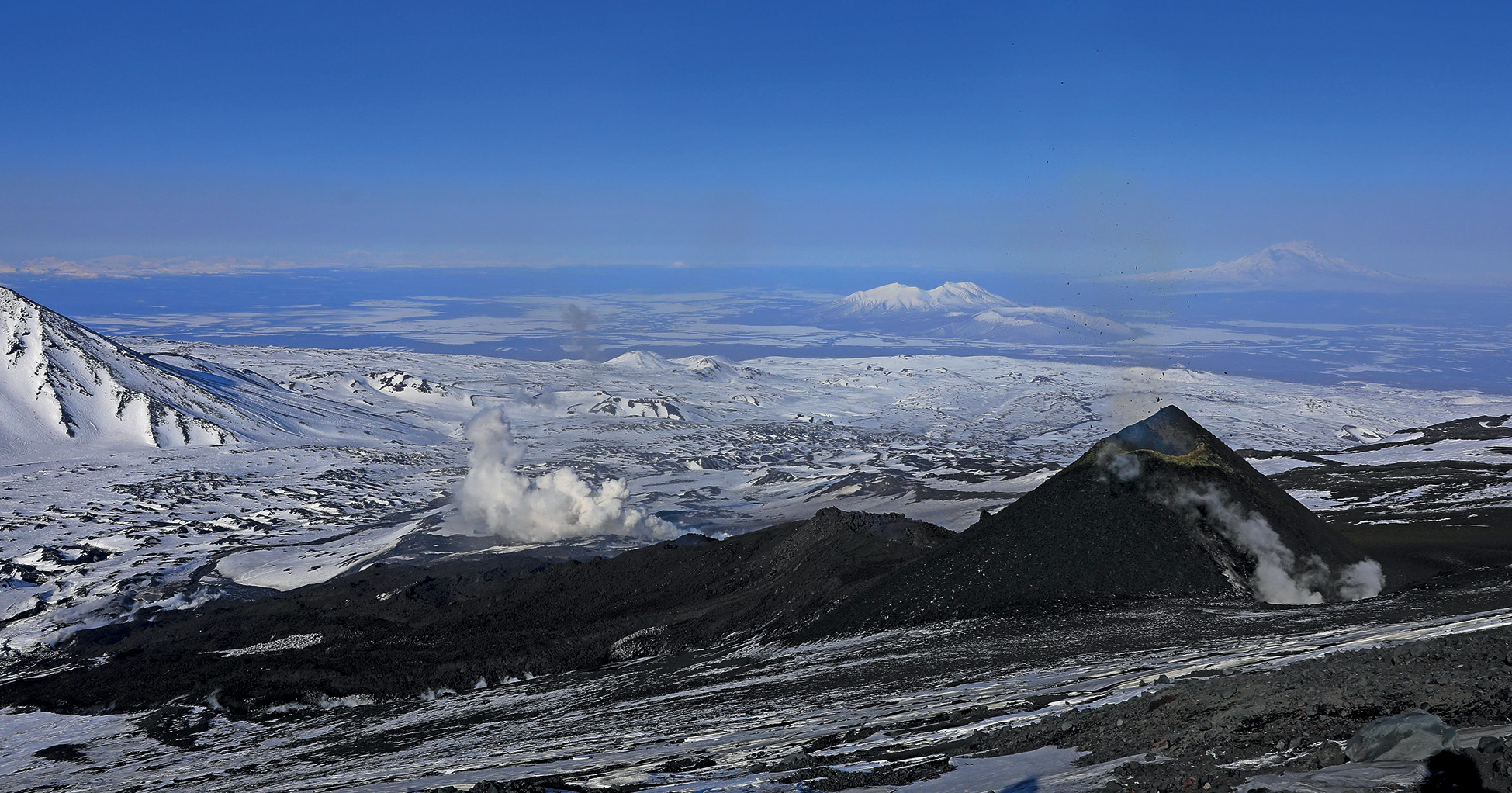 Рис. 1. Общий вид на вулкан Ключевской (вид с северо-востока). На переднем плане видны шлаковые конусы побочных прорывов. Фото Ю.В. Демянчука.