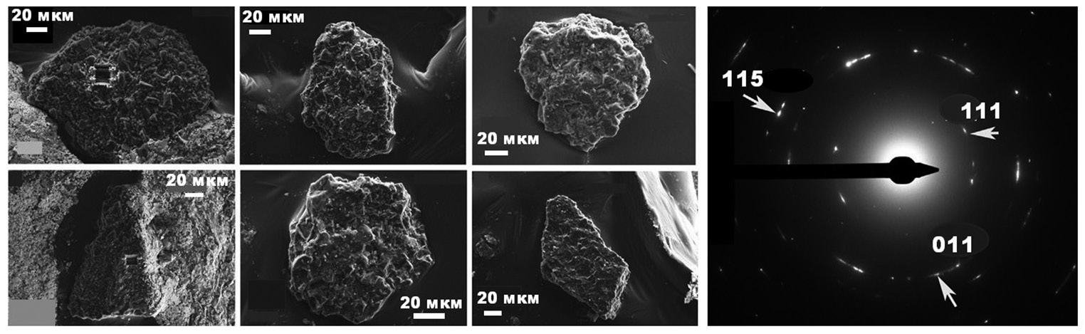 Рис. 1. Морфология и фоторентгенограмма микрополикристаллических (карбонадообразных) алмазов из продуктов извержения Авачинского вулкана [Kaminsky et al., 2016].