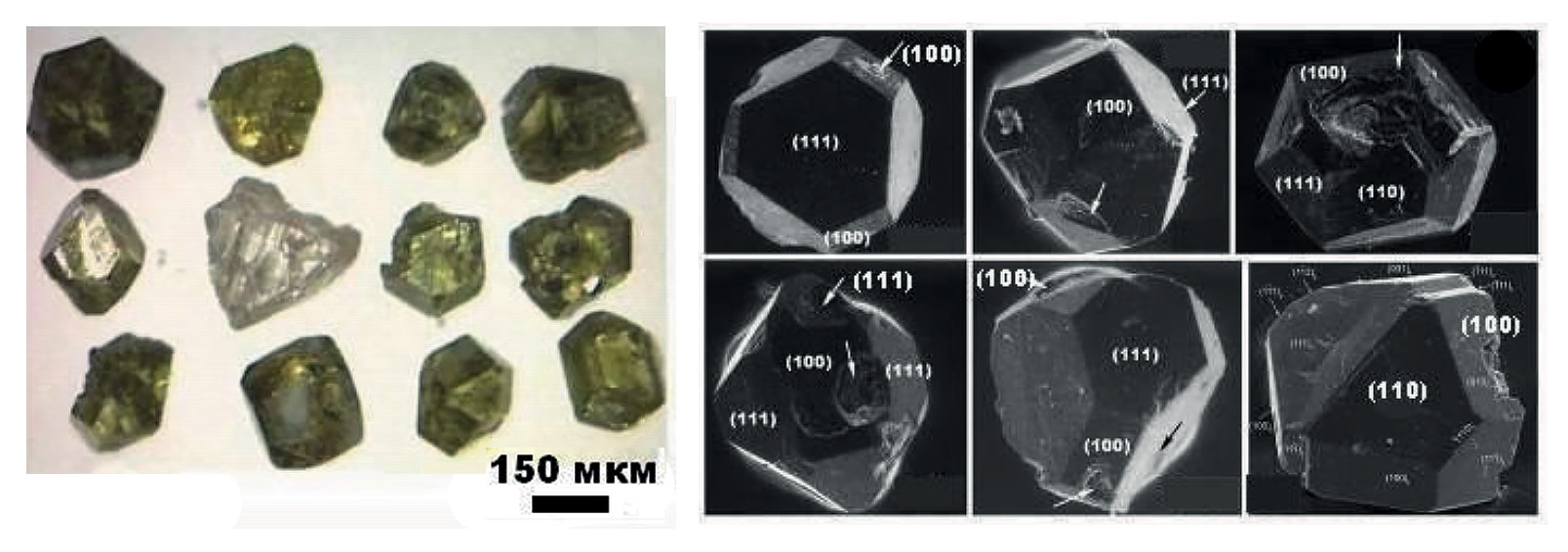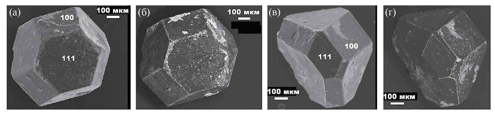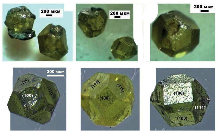 Обнаруженные в тефре алмазы варьируются по размеру в статистических пределах (456 ± 75) × (414 ± 78) × (387 ± 103) мкм, характеризуясь плоскогранно-кубооктаэдрическим габитусом (рис. 2) с акцессорными гранями ромбододекаэдра {110}, тетрагонтриоктаэдра {311}, тригонтриоктаэдра {332}. Установлена довольно частая встречаемость шпинелевых двойников, в которых на ребрах между гранями (100) и (111) выявляются узкие грани (31) и (311) тетрагонтриоктаэдра. Часть кристаллов представлена обломками. По окраске алмазы изменяются от бесцветных до желтых и желтовато-зеленых. Методом катодолюминесценции в монокристаллах выявлена зональная анатомия с октаэдрическим зародышем в центре и кубооктаэдрической оболочкой, чего не наблюдалось в синтетических алмазах. На гранях встречаются пирамидальные ямки с индукционными поверхностями совместного роста.