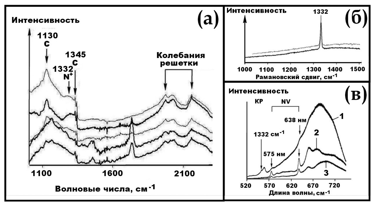 Рис. 3. Спектроскопия толбачинских алмазов. а – ИК-поглощение, б – комбинационное рассеяние (рамановская), в – фотолюминесценция.