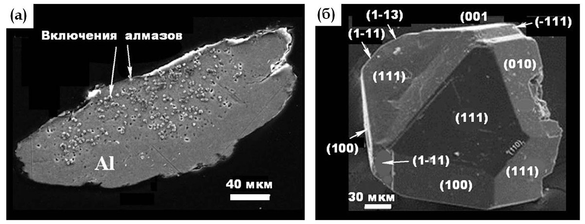 Рис. 5. Частица природного дюралюминия с микровключениями алмазов из эксплозивных продуктов извержения Ключевского вулкана (а) и типичный габитус кристаллов в шпинелевом двойнике (б).