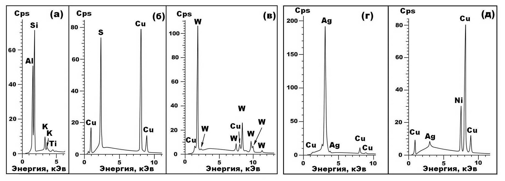 Рис. 7. ЭД-спектры, полученные от микроминералов, ассоциированных с алмазами в Озерновском месторождении. а – каолинит, б – джирит-спионкопит, в‒д – металлические сплавы (в – медно-вольфрамовый, г – медно-серебряный, д – серебряно-никель-медный).