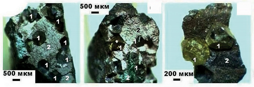 Рис. 8. Срастания алмазов (1) с квансонгитом и поликомпонентными металлическими сплавами (2) в “бобовинах” из Озерновского месторождения.