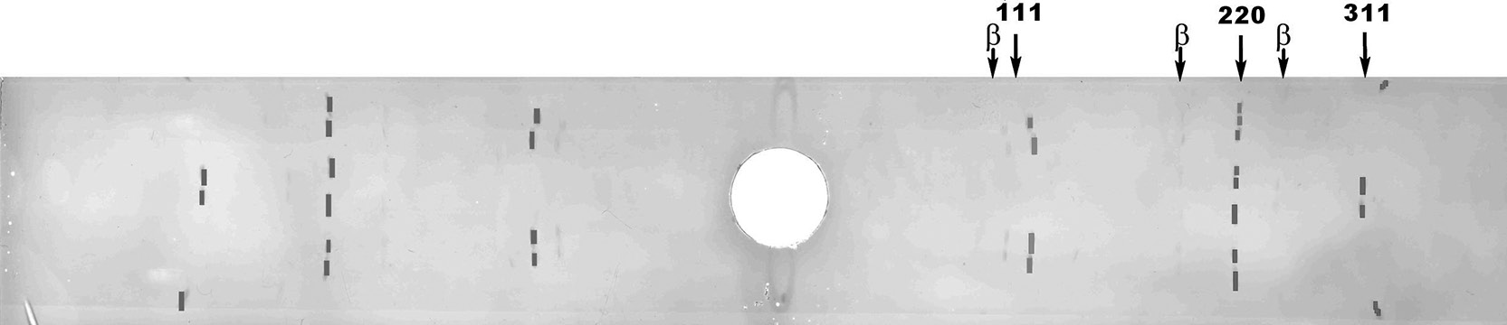 Рис. 10. Фоторентгенограмма алмаза из Озерновского месторождения. Зарегистрированы основные отражения в структуре алмаза (d, Å): 2.051–2.052 (111); 1.255–1.26 (220); 1.073 (311); параметр э. я. ао = 3.5592 ± 0.0002 Å.