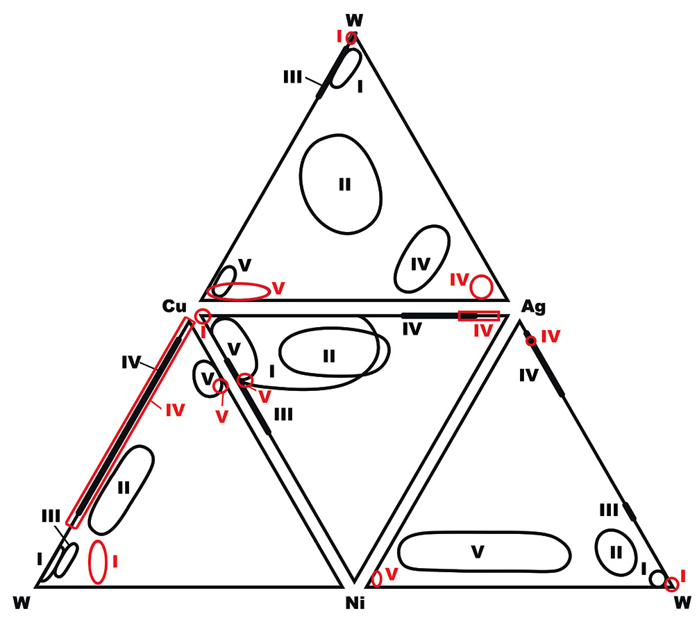 Рис. 14. Тетраэдрическая развертка составов поликомпонентных металлических сплавов в интерстициях (красные поля) и на поверхности озерновских алмазов. Сплавы: I – медно-вольфрамовые, II – медно-серебряно-вольфрамовые, III – медно-титан-вольфрамовые, IV – вольфрам-медно-серебряные, V – вольфрам-никель-медные.