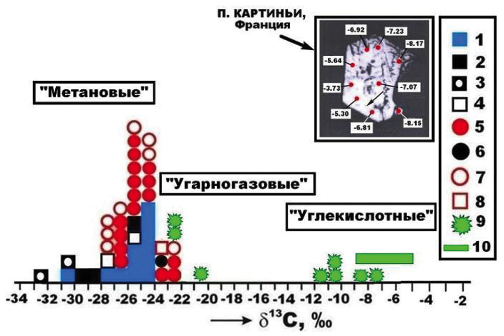 Рис. 15. Изотопный состав углерода в алмазах и других углеродных фазах вулканогенного происхождения. 1‒8 – эксплозивные продукты извержений камчатских вулканов: углеродное вещество (УВ), дисперсно-рассеянное в вулканитах (1), частицы шунгитоподобного УВ (2), парафиноподобное УВ (3), частицы самородного алюминия с включениями УВ (4), вулкано-атмоэлектрогенные алмазы (5), диуглеродные глобулы (6), карбиды (7), УВ в фумароле “Ядовитой” на вулкане Толбачинском (8); 9, 10 – озерновские алмазы, соответственно, данные авторов и лаборатории П. Картиньи (на врезке).
