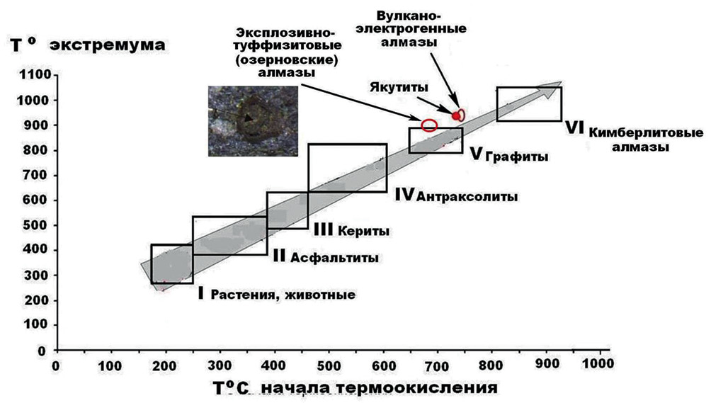 Рис. 17. Диаграмма термической устойчивости – “Лестница сгорания” [Силаев и др., 2009] – природных углеродных веществ, на фото – результат выгорания алмаза в рудах Озерновского месторождения.