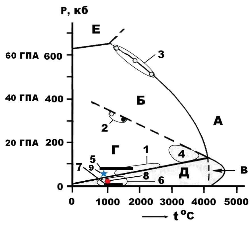 Рис. 18. Диаграмма фазовых состояний углерода, по Ф.П. Банди [Bundy et al., 1963]. Области фазовых состояний углерода: А – расплав, Б – стабильный алмаз, В – стабильный графит, Г – сосуществование стабильного алмаза и неустойчивого графита, Д – сосуществование стабильного графита и неустойчивого алмаза, Е – металлический углерод. Области синтеза алмазов: 1 – в металлических расплавах, 2 – в результате прямого перехода графита в алмаз при воздействии ударных волн, 3 – за счет углерода карбонатов, 4 – в результате гидролиза галогенидов щелочных металлов, 5 – за счет углеродных наночастиц, 6 – CVD-алмазы и алмазные пленки на алмазных затравках, 7 – алмазы, получаемые путем химического напыления, 8 – вулкано-атмоэлектрогенные алмазы; 9 – алмазы эксплозивно-туффизитового генетического типа из месторождения Озерновского.