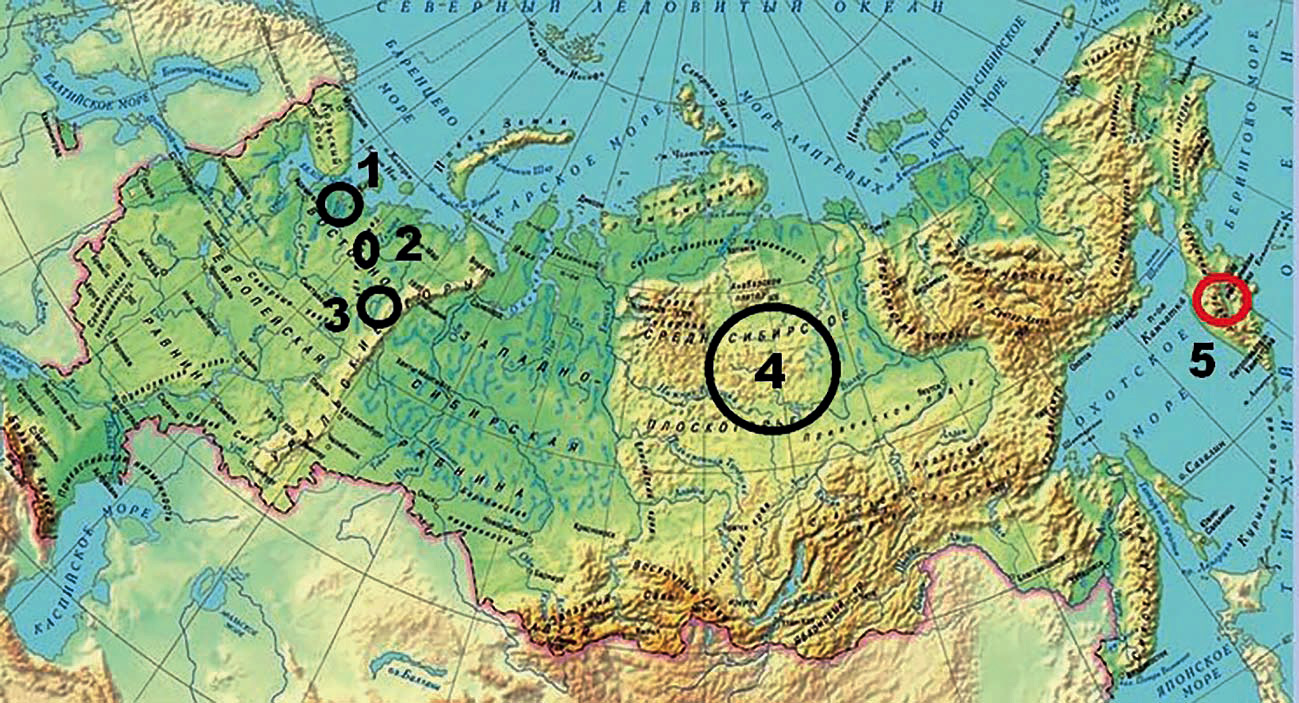 Рис. 19. Алмазоносные провинции России. 1‒3 – Восточно-Европейская с Архангельской (1), Тиманской (2) и Северо-Уральской (3) субпровинциями мантийных кимберлитовых и туффизитовых алмазов; 4 – Восточно-Сибирская (Якутская) мантийных кимберлитовых алмазов; 5 – ранее неизвестная Камчатская провинция внемантийных вулкано-атмоэлектрогенных и эксплозивно-туффизитовых алмазов.