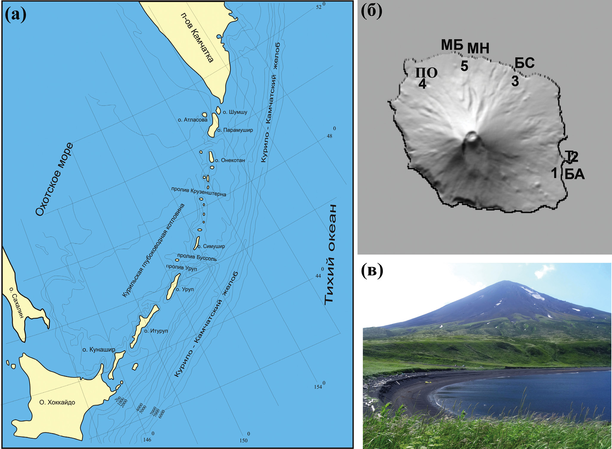 Рис. 1. Местоположение о. Атласова (а), места опробования возгонов (б), вулкан Алаид (в). 1 – бухта Алаидская (БА); 2 – побочный конус Такетоми (Т); 3 – бухта Северная (БС); 4 – прорыв Олимпийский (ПО); 5 – участок между мысами Бородавка (МБ) и Ночной (МН).