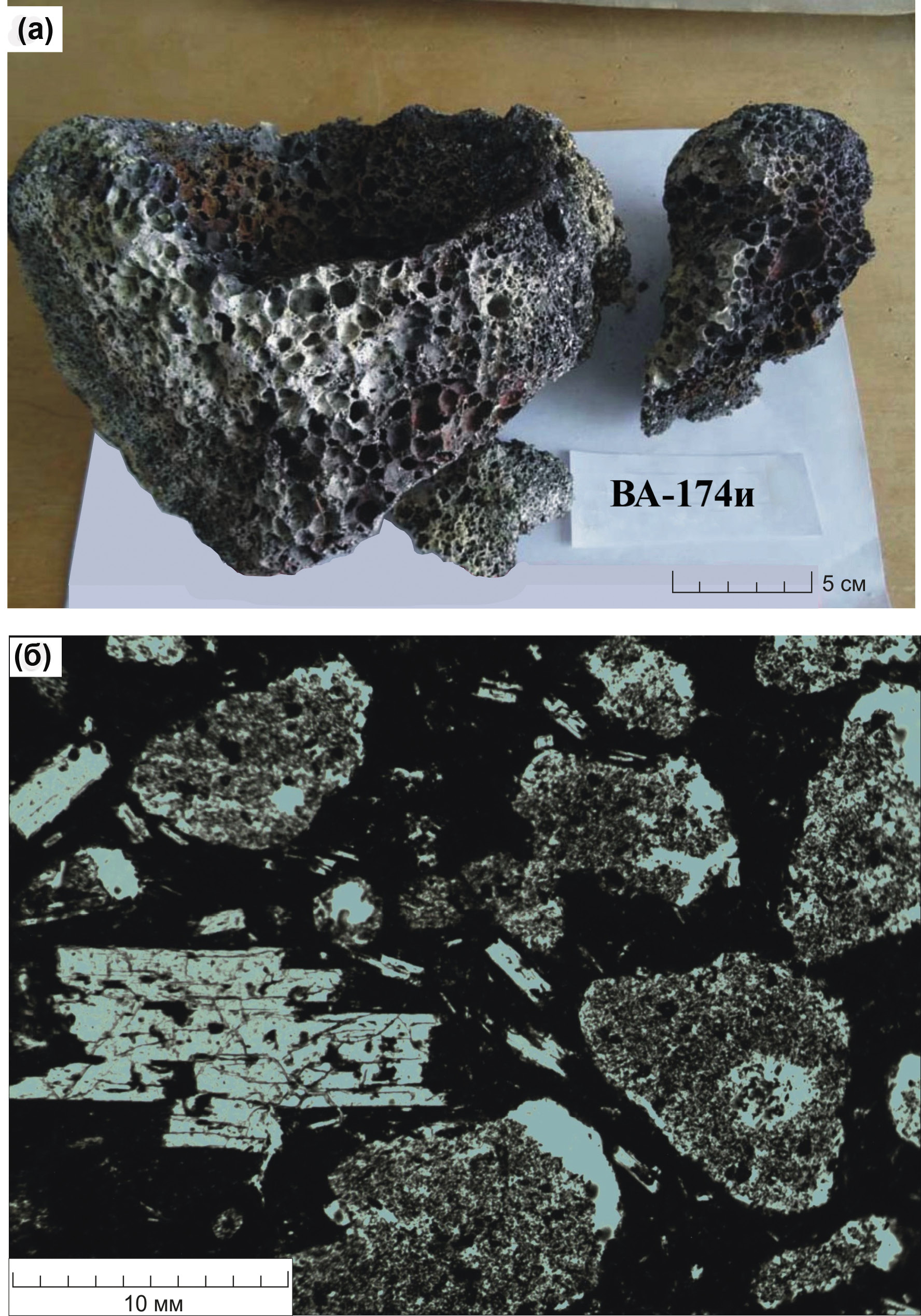 Рис. 2. Пористая прикратерная порода. а – природный штуф, порода замещена опалом (белое) и гидроксидами железа (кирпично красное); б – участок породы, поровые пространства загрязнены полировочным порошком, вкрапленники плагиоклаза разбиты трещинами, основная масса полностью изменена. Оптический микроскоп, без анализатора.
