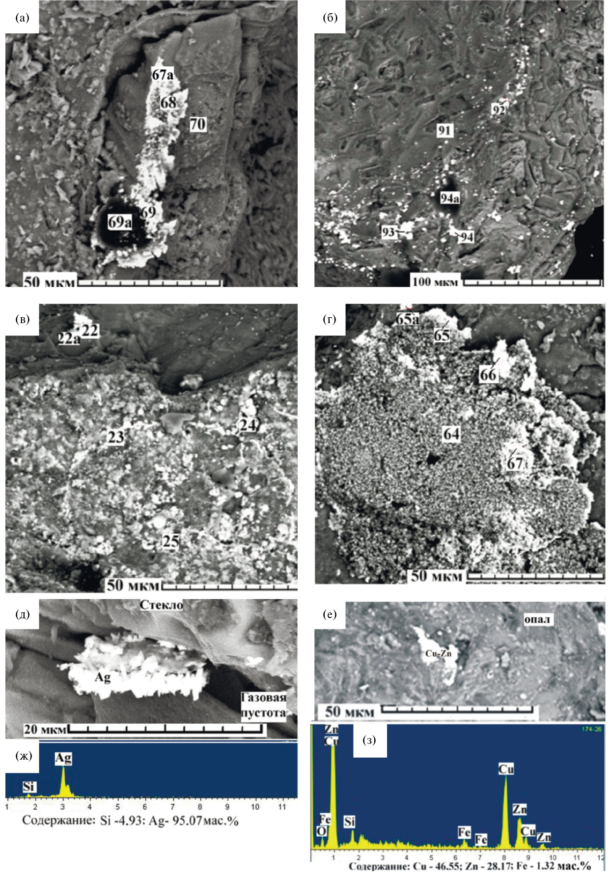 В оксидных соединениях количество железа варьирует от 70 до 97%, при этом в образцах с минимальными концентрациями железа присутствует максимальная примесь оксида хрома (табл. 3). В одном случае вместе с оксигидроксидом железа встречено серебро. В единичных случаях совместно с окисным железом в возгонах обнаружены соединения Сu, Zn и V.