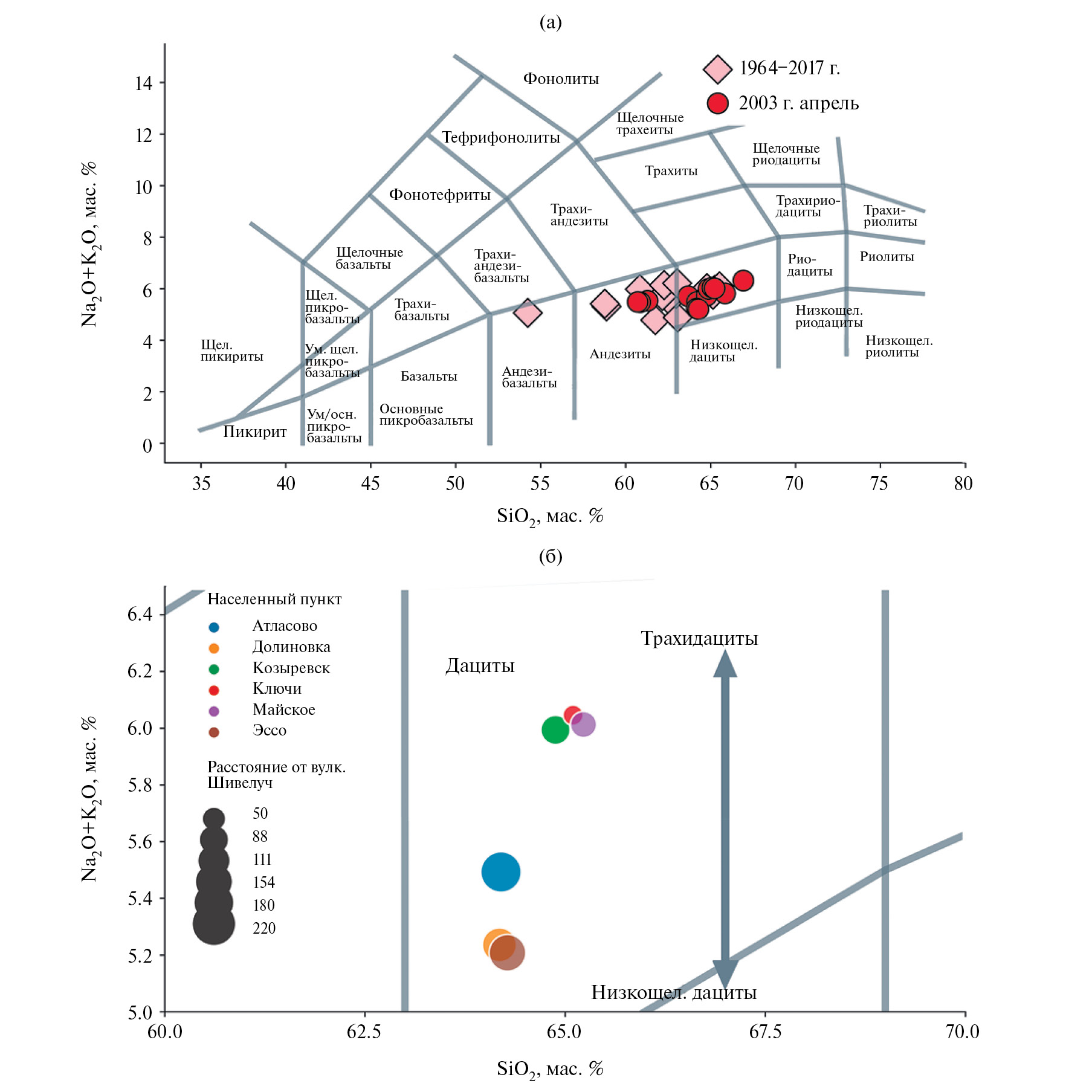 Рис. 1. Составы пеплов вулкана Шивелуч, изверженных в апреле 2023 г. и в период 1964–2017 гг. по данным из работ [Жаринов, Демянчук, 2013; Симакин и др., 2019; Гирина и др., 2007; Горбач и др., 2013] (а); состав тефры на разных расстояниях от вулкана Шивелуч (б).