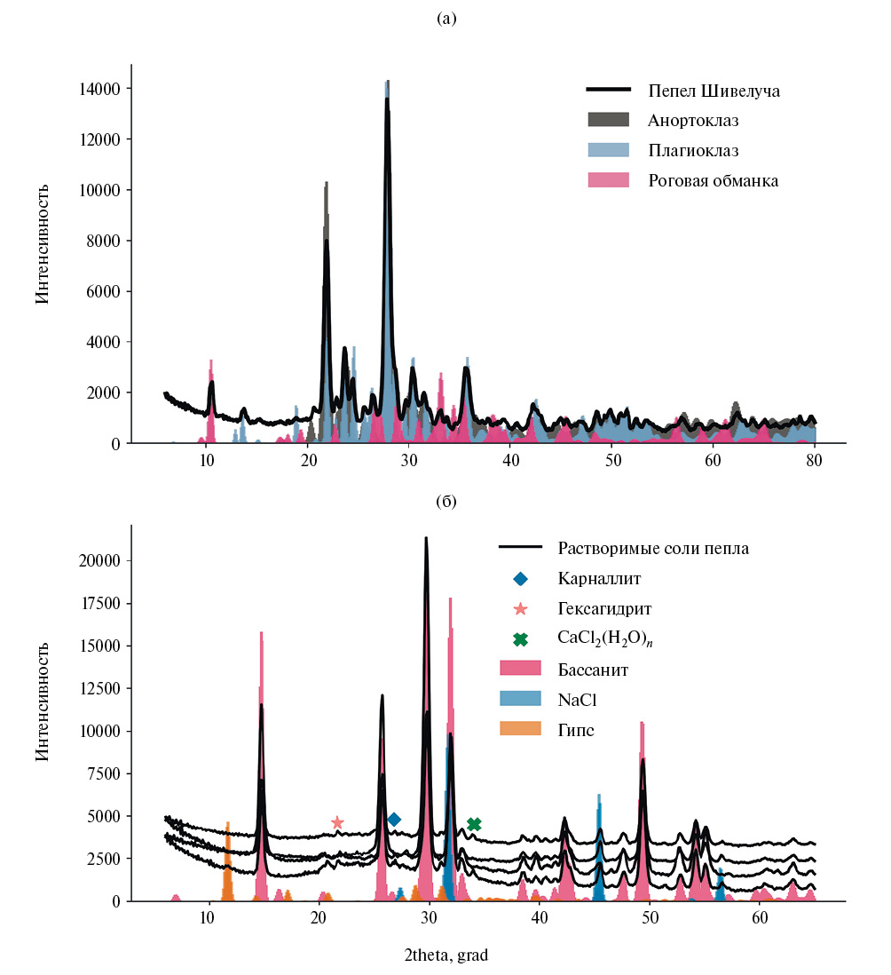 Дифрактометрия пепла показала, что его основными минеральными фазами являются анортоклаз, плагиоклаз и роговая обманка (рис. 2). Уточнение параметров элементарной ячейки трех основных породообразующих минералов позволило определить, что анортоклаз близок к чистому альбиту и имеет состав Na0.8‒1K0.2‒0AlSi3O8, плагиоклаз близок к составу анортит‒битовнит, а амфибол по параметрам элементарной ячейки близок к магнезиальной роговой обманке. В принципе, элементный и минеральный состав пепла Шивелуча сходен с составом продуктов его других извержений [Жаринов, Демянчук, 2013; Симакин и др., 2019; Гирина и др., 2007; Горбач и др., 2013].