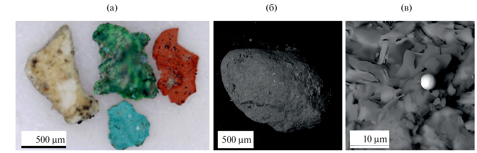 Рис. 3. Частицы пепла из пос. Анавгай: морфология частиц пепла (а); “окатанная” частица пепла, сложенная калиевыми полевыми шпатами, амфиболами и анортоклазом с вкраплениями титаносодержащего магнетита, фото в обратно рассеянных электронах (б); шарик гематита на амфиболовой частице пепла, фото в обратно рассеянных электронах (в).