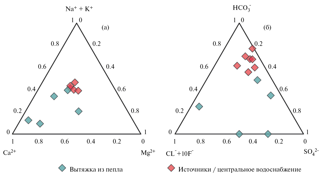 Водные вытяжки из свежих пеплов являются хлоридно-сульфатными, магний-кальциевыми, с преимущественно кислой реакцией среды. По мере старения пепловых отложений, которое заключается в последовательном промывании тефры метеорными водами, контактные воды становятся более гидрокарбонатными, с преимущественно нейтральным pH, и водная вытяжка из пеплов приближается по составу к водам холодных ключей поселка и водам центрального водоснабжения. В первую очередь, из пеплов вымываются все растворимые соли, и минерализация воды снижается практически на порядок (см. табл. 2–4). Наиболее заметно вымывание растворимых хлоридов и сульфатов аммония и алюминия, эти соли быстро исчезают из контактных растворов. Растет содержание гидрокарбонатов; воды, контактирующие с тефрой, из хлоридно-сульфатных магний-кальциевых становятся сульфатно-гидрокарбонатными натрий-кальциевыми (см. рис. 4).