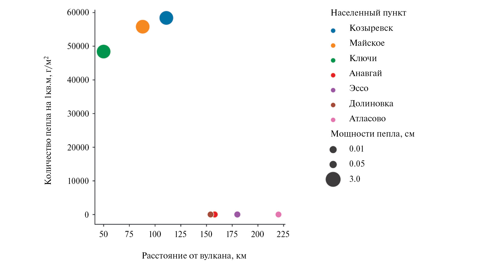 Рис. 5. Количество пепла (г/м2) на разных расстояниях от вулкана Шивелуч после его извержения 10–13 апреля 2023 г.